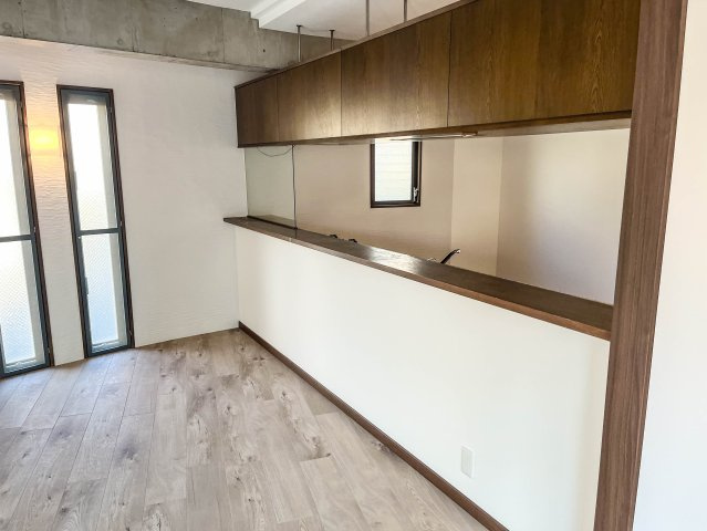 温かみのある色調の大きなカウンターがある対面式キッチン♪