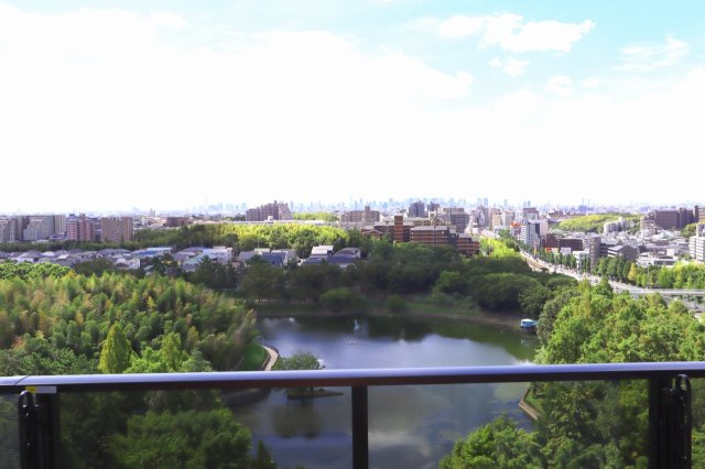 バルコニーからは眼下には春日大池を擁すな桃山公園が遠くには大阪市内を一望の眺望です♪